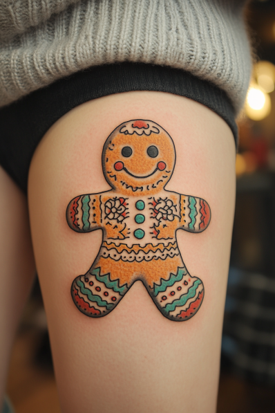 I can t get over how fun and upbeat this tattoo is! It brings a sense of nostalgia, reminding me of baking cookies and decorating them with way too much frosting. It s festive in the best way possible, capturing the magic of the holidays while still being totally fun and lighthearted. Perfect for anyone who wants to keep the spirit of Christmas alive all year round and let s be honest, who can resist a happy little gingerbread buddy like this?