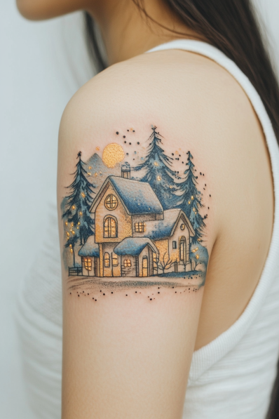 This dreamy tattoo features a picturesque Christmas village scene, complete with snow-dusted rooftops, cozy cottages, and tall pine trees standing like silent guardians in the background. The warm golden light glowing from the windows brings the whole scene to life, making it feel inviting and full of holiday spirit. A gentle snowfall surrounds the village, and a full moon shines softly overhead, adding a serene, magical touch that captures the essence of a quiet, festive winter s night.