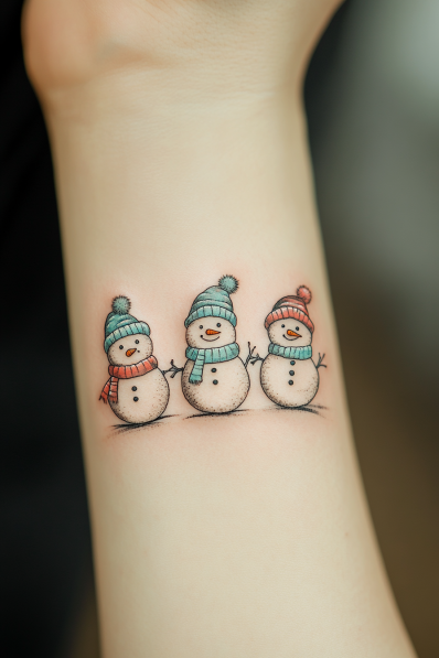 This endearing tattoo captures the warmth of the holiday season with a charming snowman family. The trio of snowmen is dressed in cozy hats and matching scarves, each in a different pastel shade of blue, pink, and orange, creating a playful and heartwarming scene. Their happy expressions and twig arms reaching out to hold hands emphasize the love and togetherness of family. Soft, delicate shading gives the design a frosty yet gentle feel, making it a perfect representation of wintery joy.