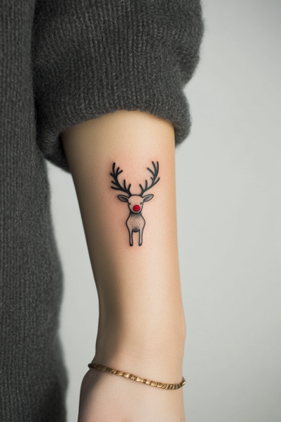 I think this tattoo is pure holiday fun, perfect for someone who wants a small but festive piece of ink. It s playful, recognizable, and incredibly cute without being overly flashy. The minimalist style makes it easy to love and easy to show off, reminding you of childhood Christmas magic and the famous story of Rudolph leading Santa s sleigh. If you re into the less is more approach but still want to celebrate the season, this little reindeer is the perfect way to do it.