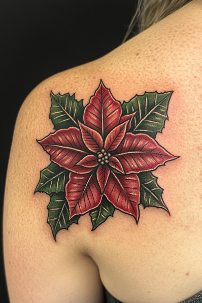 This vibrant tattoo showcases a stunning poinsettia, the ultimate floral symbol of the holiday season. With lush, deep red petals fanned out in a star shape and rich green leaves framing the flower, the piece feels alive with festive energy. The traditional tattoo style shines through in the bold black outlines and striking color contrast, giving the design a timeless and eye-catching look. Each petal and leaf features meticulous shading that adds depth and texture, making it seem almost as if the flower is blooming right off the skin.