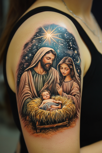 This breathtaking tattoo captures the essence of the Nativity, with Joseph, Mary, and baby Jesus lovingly depicted in a serene and holy moment. The holy family is surrounded by a warm, divine glow that emanates from the Star of Bethlehem shining brightly above. Mary and Joseph s expressions are full of peace and reverence as they gaze down at the newborn Savior, who rests gently in a humble manger of golden hay. The night sky, dotted with countless stars, creates a celestial background that makes the scene feel even more divine and ethereal.