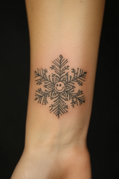 This cute and quirky tattoo features a beautifully detailed snowflake with a cheerful twist: a happy smiley face right in the center! The snowflake s delicate branches are adorned with intricate linework, giving it a lacy and whimsical appearance. Despite being monochromatic, the design feels vibrant and full of life, thanks to the joyful expression that makes the snowflake seem like it s beaming with holiday cheer.