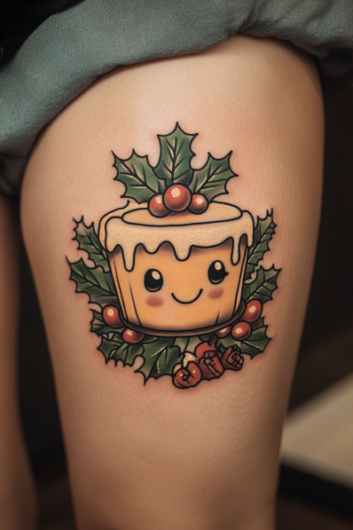 This fun and festive tattoo showcases an adorable Christmas pudding with a cheerful smile and twinkling eyes. The pudding is topped with glossy white icing, draping perfectly over its round, golden form, and it s decorated with a sprig of holly featuring bright red berries. Cute little cinnamon sticks and anise stars are tucked around the base, adding extra holiday flair. The design is full of bright colors and playful details, giving off the vibe of a kawaii-style holiday treat.