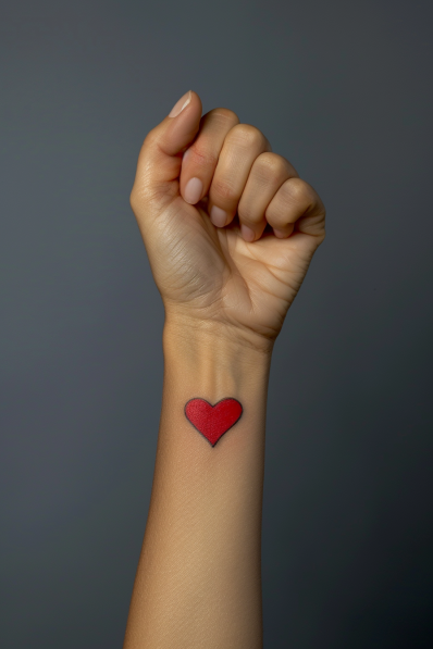 This tattoo showcases a small, bold red heart, placed neatly on the skin with a minimalist design. The solid red color makes the heart pop, while the clean edges keep it looking sharp and polished. There s no shading or intricate detailing here just a pure, classic heart in all its simplicity. It s a straightforward yet powerful symbol, representing love, passion, or a deep personal connection. Sometimes, the simplest designs can speak the loudest.