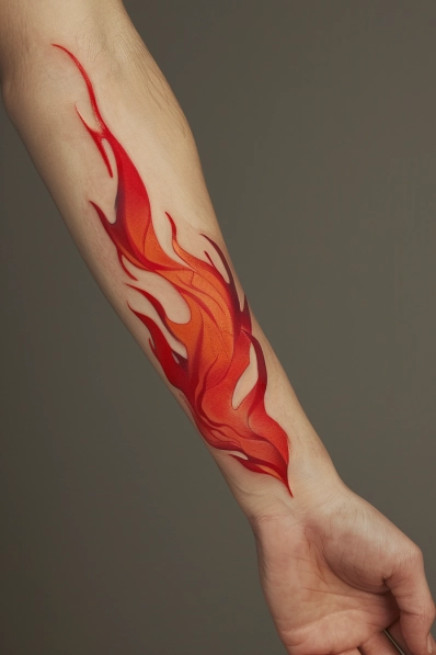 This tattoo brings the heat literally! A bold red flame blazes down the arm, with swirling, sharp edges that mimic the natural movement of fire. The gradient of reds, oranges, and yellows gives the flames a dynamic and realistic feel, as if they re flickering and burning across the skin. The design is fluid, yet edgy, with every curve of the flame drawing attention to the arm s natural shape. It s an intense, energetic tattoo that radiates power and passion.