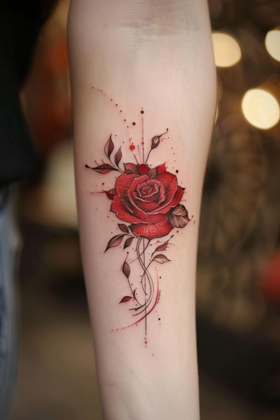 This stunning tattoo features a beautifully detailed red rose as its centerpiece, surrounded by delicate, swirling vines and buds. The shading on the petals gives the flower a realistic 3D effect, while the thin black outlines and dots add an almost whimsical, artistic flair to the design. It feels as if the rose is blooming right off the skin, with the perfect balance of boldness and softness. The subtle use of light pink highlights enhances the depth of the design, making it both eye-catching and graceful.