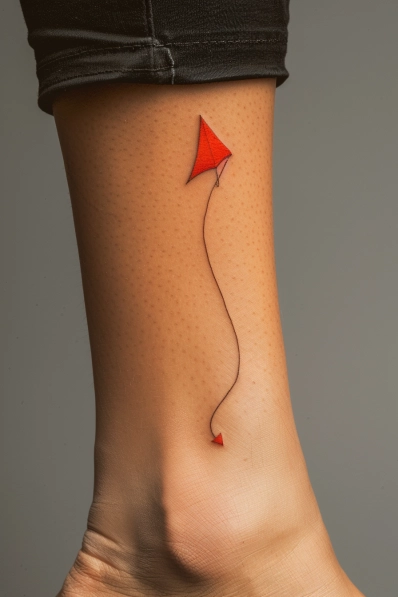 This minimalist tattoo features a small, bright red kite gracefully flying up the ankle, attached to a thin, delicate string that trails behind it. The simplicity of the design is what makes it so charming just a classic kite, full of nostalgic fun, with its bright color adding a lively touch to the overall look. The thin line of the string gives the illusion that the kite is in motion, as if it s floating upwards with the breeze.