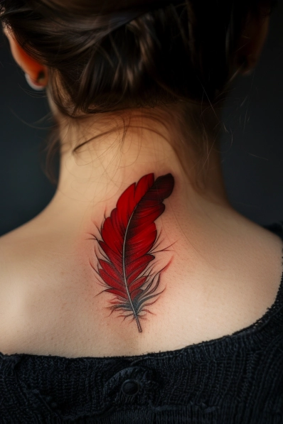 This beautifully detailed red feather tattoo stands out with its bold use of color and soft shading. The feather s gradient of deep red to black adds dimension and depth, giving it a lifelike quality. The feather s delicate lines and wisps of shading around the edges create a sense of movement, as if it s gently floating on the skin. It s a simple yet striking design that captures the elegance and symbolism of freedom, lightness, and personal growth.