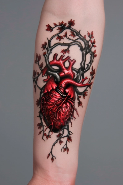 This tattoo takes a literal spin on the heart, featuring a highly detailed anatomical heart entwined with twisting black branches. The deep red of the heart contrasts beautifully with the dark branches, which seem to grow out of and around it, with tiny red leaves sprouting from them. The intricate shading and highlights give the heart a realistic, almost three-dimensional appearance. The combination of the organic branches and the lifelike heart creates a powerful visual metaphor for life, growth, and emotion.