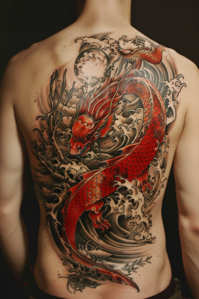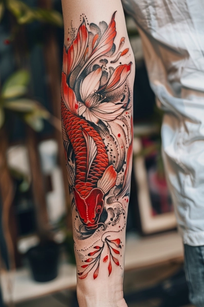 I have to say, this tattoo is an absolute showstopper. The red koi, often a symbol of strength and perseverance, is a bold choice for anyone wanting to express resilience or a journey through life s challenges. The mix of bold red and soft grey really makes the koi pop, giving it a powerful presence without overwhelming the overall composition. It s the kind of tattoo that tells a story, and I m totally here for it! If you want something that stands out, this piece definitely delivers.