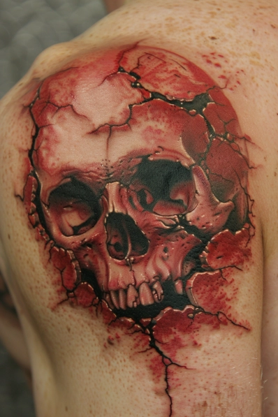 This hardcore tattoo features a cracked, menacing skull breaking through the skin, with deep shades of red surrounding the entire design. The skull itself is detailed with realistic shading, making it appear as if it s bursting out of a rough, broken surface. The jagged cracks running through the red and black ink add to the intensity, giving the whole piece a raw, unpolished vibe. It s like the skull has been unearthed from some dark place, with the texture almost feeling like crumbling stone or a freshly cracked earth. Definitely not for the faint-hearted!