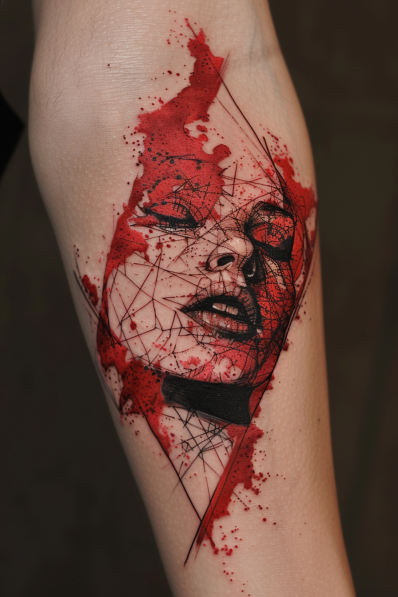 This tattoo is a captivating mix of abstract art and portraiture, blending realism with chaotic geometric lines and splashes of red ink. The face, shaded in fine detail, appears to be fading or emerging from the bold red splatters that surround it. Thin, intersecting black lines create a web-like effect across the portrait, giving the design a futuristic or almost glitch-like quality. The combination of realistic facial expression with abstract elements creates a mesmerizing contrast that makes this tattoo feel like something straight out of an avant-garde art gallery.