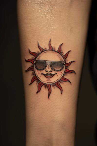 This fun and quirky tattoo features a smiling sun wearing a pair of sleek sunglasses. The sun s rays are drawn with a vibrant red outline, giving the design a fiery, energetic feel. The sunglasses add a cool, laid-back vibe, making the sun look like it s ready to hit the beach or just relax under the sky. The dotted shading on the sun s face adds some texture, making the tattoo pop with a unique cartoonish style.