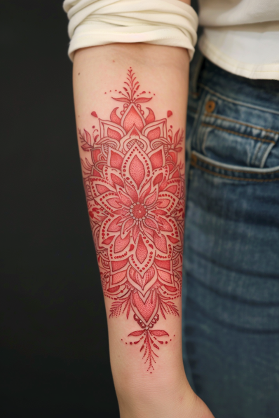 This tattoo features an intricately detailed red mandala, radiating symmetry and balance. The design is filled with geometric patterns, floral shapes, and fine linework, creating an overall stunning visual that pulls you in. The use of soft red ink adds a unique twist, giving it an ethereal and delicate feel while still remaining bold and prominent. The layering of petals and ornate shapes gives this tattoo depth, almost like it s unfolding before your eyes. There s a calm yet mesmerizing energy to this piece, making it both beautiful and soothing.