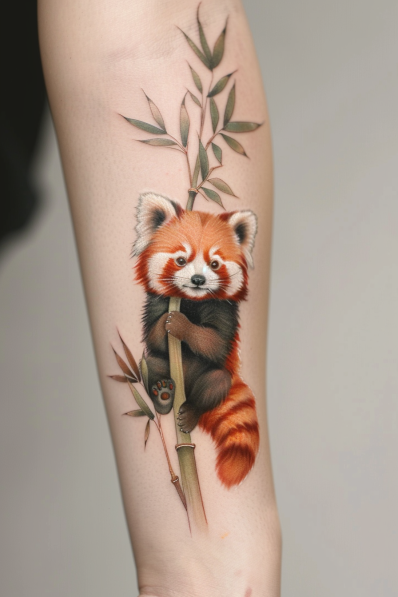 I ve got to say, this red panda tattoo is beyond adorable! It s perfect for anyone who loves animals, especially since red pandas are known for their playful and curious nature. The way it s hugging the bamboo is just too cute, and the colors are so vibrant. This tattoo would be an instant conversation starter, and it s hard not to smile when you look at it. If you re after a tattoo that s both fun and heartwarming, this little guy checks all the boxes!