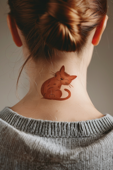 This adorable tattoo features a small, contented cat curled up and smiling, with its eyes gently closed in bliss. The soft red and brown tones give the design a warm, cozy feel, while the fine linework and delicate shading capture the texture of the fur perfectly. Positioned just below the nape of the neck, this little feline radiates a calm and peaceful vibe, almost like a tiny guardian watching over you.