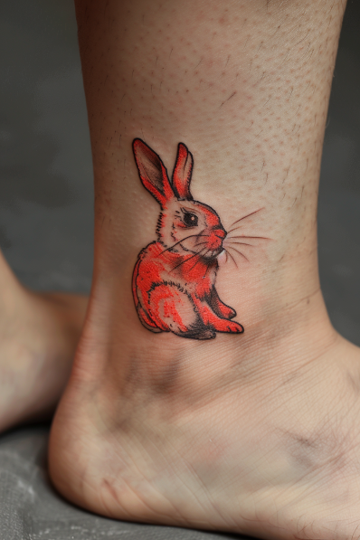 This charming tattoo features a cute red bunny, sitting patiently with its big ears perked up. The soft red shading gives the bunny a warm, cuddly feel, while the fine black outlines and subtle details bring out its fur texture and adorable expression. The small size and placement near the ankle make it an understated yet playful design, perfect for someone who loves animals or wants a touch of whimsy in their ink.