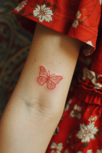 This tattoo is a simple yet elegant red butterfly, drawn with clean, fine lines that form its delicate wings. The design is minimalistic, focusing on the beauty of the butterfly s shape without adding any heavy shading or extra details. The use of red ink gives it a unique twist, making the butterfly stand out in a subtle, graceful way. It s the kind of tattoo that feels light and airy, perfect for someone who loves understated designs with a bit of flair.