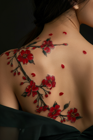 This stunning tattoo elegantly drapes across the skin with delicate red cherry blossoms in full bloom. The flowers are connected by soft, flowing black branches, creating a natural, graceful curve that perfectly complements the body s shape. The red petals are vivid and eye-catching, contrasting beautifully with the soft black ink of the branches and leaves. Scattered petals falling around the design add a touch of movement and whimsy, making the tattoo feel like a fleeting moment captured in time.