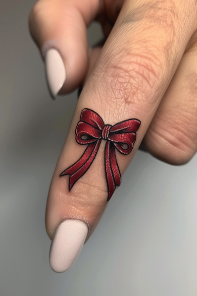 This tiny yet elegant tattoo features a beautifully detailed red bow wrapped around the finger. The bow s shading gives it a three-dimensional appearance, with rich, deep red tones that make it pop against the skin. The delicate black outlines keep the design crisp and refined, giving the tattoo a subtle but sophisticated charm. Its placement on the finger adds to the playful and dainty feel, making it a stylish little accessory that you never have to take off.