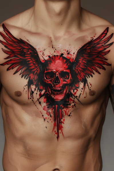 This intense chest tattoo features a red skull with bold, extended wings spreading across the upper torso. The deep red and black ink creates a dramatic contrast, giving the skull a fiery, menacing look. The splattered ink effect around the design adds to the raw, chaotic energy of the piece, as if the skull is emerging from a burst of flames. The wings are detailed with sharp feathering, which makes the entire design feel like it s ready to take flight.