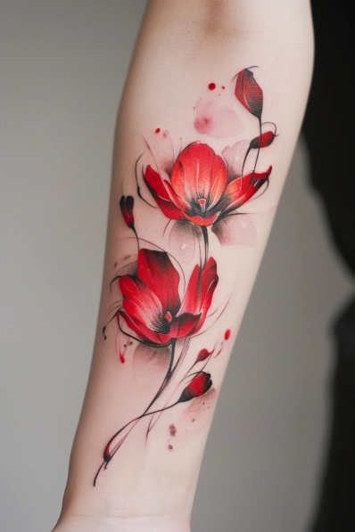This stunning tattoo showcases bold red flowers in full bloom, delicately arranged on slender black stems. The petals are beautifully shaded, transitioning from a rich red to soft highlights, giving the flowers a sense of depth and realism. The use of watercolor-like splashes around the flowers adds a dreamy, artistic touch, making it feel like a piece of living art. The combination of soft red hues with minimal black detailing creates an elegant and graceful flow to the design.