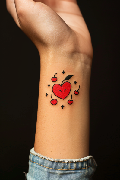 This fun and quirky tattoo features a cute heart at the center, accompanied by small, cheerful cherries. The minimalist design is playful, with tiny stars scattered around to add a bit of sparkle. The bold red color makes the heart and cherries pop, while the simple black outlines give it a clean, cartoon-like vibe. It s a lighthearted design that s perfect for someone looking for something small and sweet, but with a bit of personality.