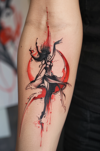 This tattoo captures the graceful movement of a dancer mid-pose, surrounded by swirling red and black ink that adds a sense of flow and energy to the design. The dancer s silhouette is elegantly outlined in black, with sharp lines and soft shading bringing out the form and movement of her figure. The red splashes behind her create a dramatic backdrop, emphasizing the fluidity of her movements and giving the design an almost ethereal quality.