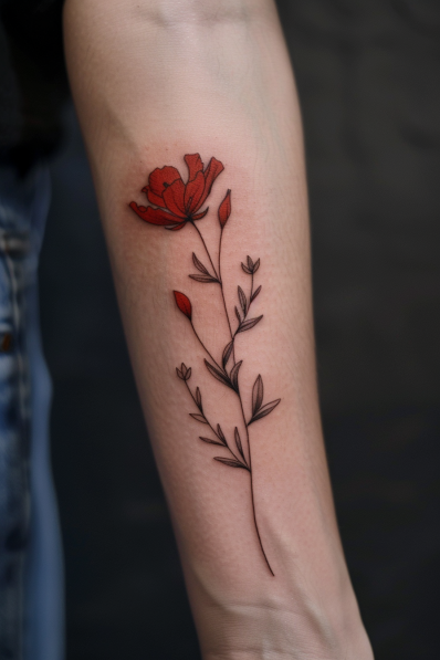 This minimalist tattoo features a single red flower in bloom, delicately perched on a slender, black-outlined stem with small buds and leaves. The simplicity of the design gives it a light and airy feel, while the vibrant red petals stand out against the clean black lines. The fine linework creates a natural, elegant look, and the minimal shading keeps it understated but graceful. It s a subtle design that whispers rather than shouts, yet it draws the eye with its soft beauty.