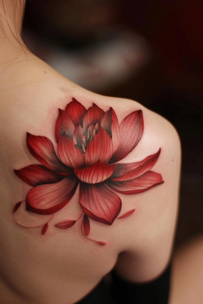 This eye-catching tattoo features a large, vibrant red lotus flower blooming beautifully across the skin. The petals are meticulously detailed with delicate shading, transitioning from deep red to soft highlights, which give the flower a three-dimensional, almost velvety appearance. The symmetrical layers of petals create a striking sense of balance and harmony. The overall design feels both graceful and powerful, with smaller, falling petals adding a touch of movement to the piece.