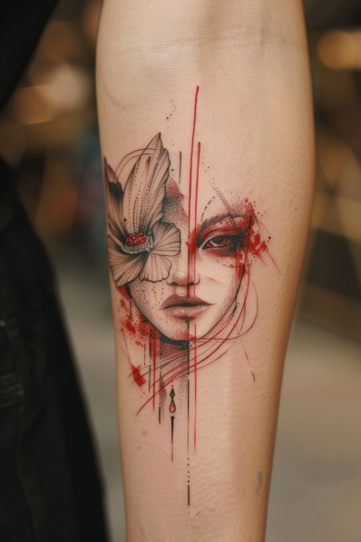 This captivating tattoo blends realism with abstract artistry, featuring a striking woman s face highlighted by bold red accents and intricate black shading. One side of her face is beautifully complemented by a large, detailed flower, creating a unique contrast between softness and intensity. The splashes of red and the sharp vertical lines add an avant-garde, surreal vibe, as if her face is emerging from an artistic explosion. The fine linework and splatter details give the piece an edgy, modern feel.