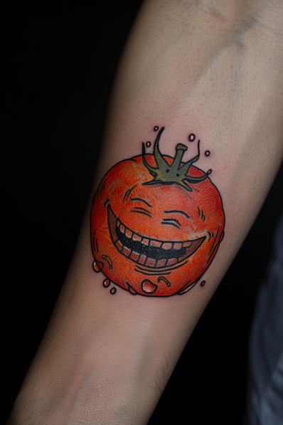 This tattoo features a hilarious, grinning tomato with a mischievous smile, giving the design a unique and playful twist. The deep red color of the tomato contrasts with the bold black outlines and exaggerated features, making it stand out. The simple yet bold design captures the humor and fun in turning an everyday vegetable into something full of personality and attitude.