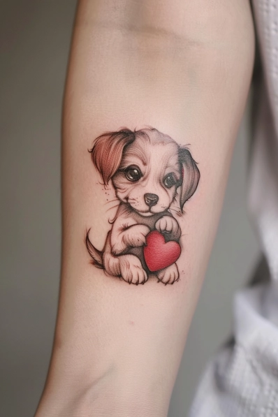 I have to say, this is hands down one of the cutest tattoos I ve ever seen. I mean, who wouldn t fall in love with a puppy holding a heart? It s the perfect mix of sweet and sentimental, and it s got just the right amount of playful charm. Whether you re a dog lover or just someone who loves all things cute, this tattoo is guaranteed to make people smile. It s like having a tiny bundle of love inked right onto your skin what s not to love?