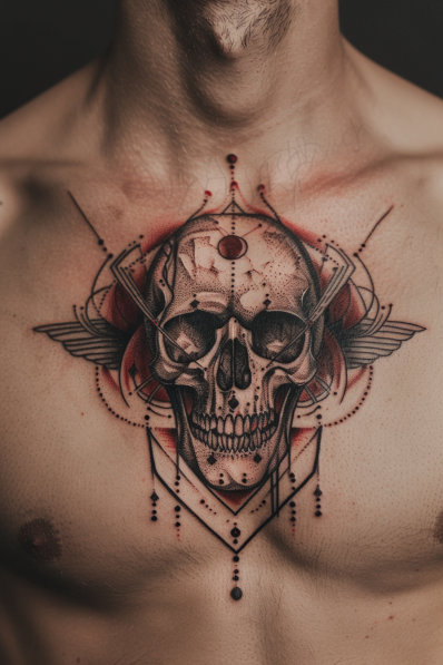 This tattoo is an edgy fusion of geometry and realism, with a menacing skull at the center surrounded by sharp geometric lines and abstract shapes. The symmetrical wings and precise dotted patterns add an almost mechanical vibe to the design, while the red shading behind the skull gives it a fiery intensity. It s a bold and aggressive design that feels almost futuristic, with the mix of linework, shading, and subtle dotwork creating a striking contrast.