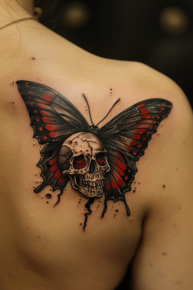 This tattoo combines the delicate elegance of a butterfly with the bold intensity of a skull. The butterfly s wings are detailed with dark, shadowy hues and blood-red accents that give off a striking contrast. At the center of the design is a skull, perfectly integrated into the butterfly s body, creating a unique blend of life and death. The shading work on the skull adds depth, while the red accents make it pop, giving the whole piece a sense of movement and mystery.
