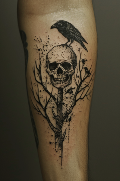 This tattoo brings together eerie elements of nature and death in a hauntingly beautiful design. A skull is perched atop a tree branch, with a raven resting ominously above it. The bare branches give off a spooky, desolate vibe, while the splashes of ink around the design add texture and drama. The raven, known as a symbol of death and mystery, ties the piece together with its dark presence, perfectly complementing the skeletal imagery below.