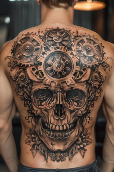 This tattoo is a jaw-dropping fusion of skull art and steampunk aesthetics. The skull, intricately shaded and massive in scale, is adorned with mechanical gears and cogs that stretch across the back, creating a mesmerizing industrial vibe. The metal elements are perfectly integrated into the skull s design, giving it a surreal, machine-like appearance. The shading is rich, with deep blacks and smooth transitions that make the gears look like they re about to start turning any second.