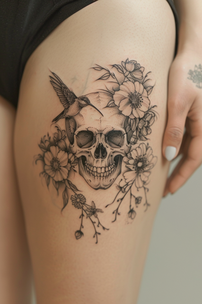 This tattoo features a delicate skull surrounded by blooming flowers, with a tiny hummingbird hovering near the top. The contrast between the fragile, detailed skull and the soft petals creates a beautiful balance between life and death. The hummingbird adds a sense of grace and vitality, symbolizing the fleeting nature of life and how precious each moment is. The design is finely detailed, with elegant linework that brings out the softness of the flowers and the intricate structure of the skull.