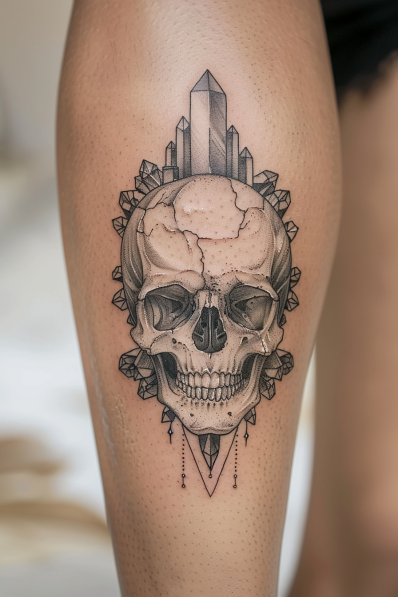 This tattoo features a highly detailed skull sitting beneath a crown of sharp, geometric crystals. The crystals rise behind the skull, adding height and a mystical element to the design. The clean linework and precise shading bring out the textures of both the crystals and the skull, creating an eye-catching combination of organic decay and geometric symmetry. The delicate dot work around the crystals adds even more depth and elegance to the design.