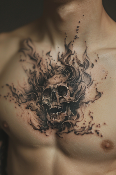 This tattoo is a dramatic portrayal of a skull engulfed in swirling flames. The dark shading and intense detail give the skull a menacing appearance, while the flames seem to wrap around it like a fiery aura. The smoke-like wisps give the piece a sense of movement, making it look almost alive, like it s rising from the ashes. The detailed linework and expert shading make the flames blend seamlessly with the skull, creating a fierce and intense design.