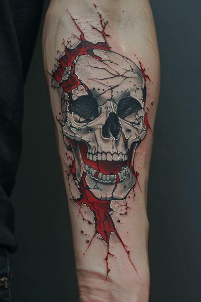 This tattoo features a skull that looks like it s breaking through the skin, with bold red cracks giving it an almost explosive feel. The shading on the skull is hyper-realistic, making it appear as though it s tearing through the flesh, while the jagged red lines add a layer of intensity and chaos. The cracks run deep, creating a raw, fractured look that gives the entire design a fierce energy. It s a head-turning piece that feels as powerful as it looks.