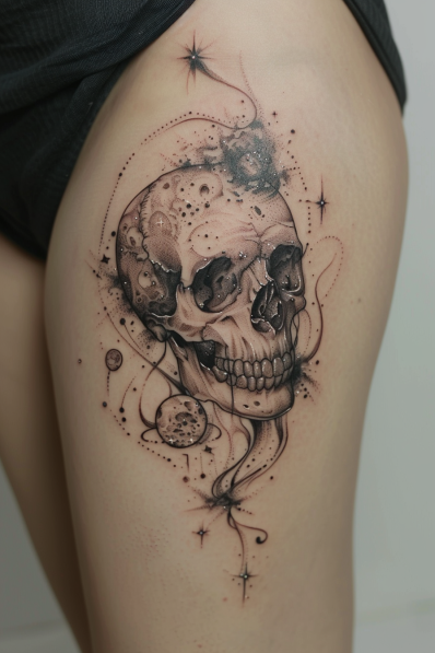 What s amazing about this tattoo is how it mixes the themes of mortality with the infinite universe. It s like a visual representation of the idea that even in death, we re part of something much bigger and more mysterious. The cosmic elements give it a sense of wonder and exploration, reminding us that life and death are just two parts of an endless journey. If you re a dreamer with a love for the stars and all things celestial, this tattoo is definitely out of this world!