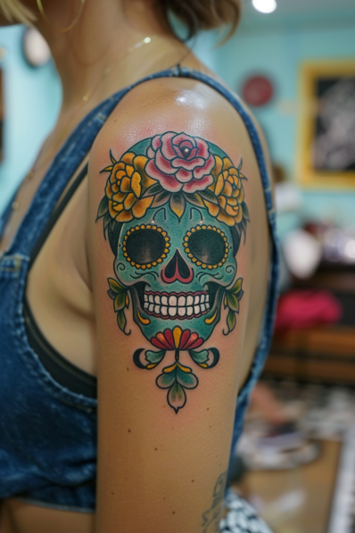This tattoo is a vibrant celebration of the iconic sugar skull, adorned with bold, rich colors and floral details. The skull features intricate patterns, surrounded by vivid yellow and red flowers on the forehead, adding to its festive feel. The mix of teal, orange, and pink gives it that unmistakable Day of the Dead vibe, while the decorative accents bring the design to life in an almost playful way. It s bright, eye-catching, and full of cultural significance.