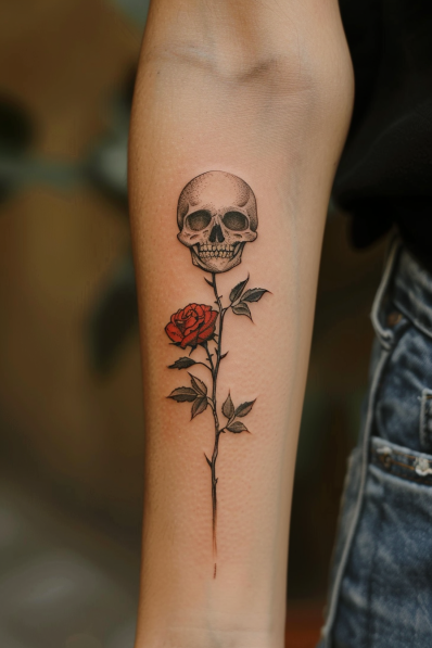This tattoo features a striking skull with its base merging into the stem of a delicate rose. The bold red hue of the rose adds an intense contrast against the black and gray tones of the skull and stem. The fine details in the petals and leaves showcase a clean, precise style, while the skull adds a darker, edgier vibe to the overall piece. It s elegantly designed with a vertical flow that makes the elements blend seamlessly.