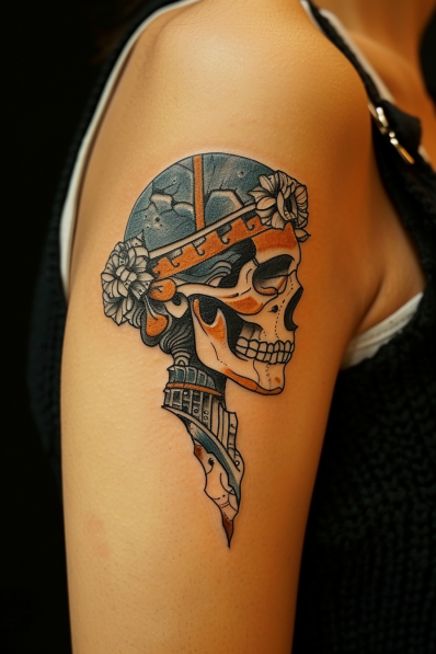 This tattoo features a highly stylized skull, adorned with what appears to be a warrior s helmet and armor. The bold colors of orange and blue give the design a regal, almost ancient feel, while the flowers on the skull s crown add a softer touch. The skull s profile view emphasizes its intricate details, from the cracks in the bone to the flowing lines of the helmet. The combination of the warrior elements with the skull gives the tattoo a powerful and commanding presence.