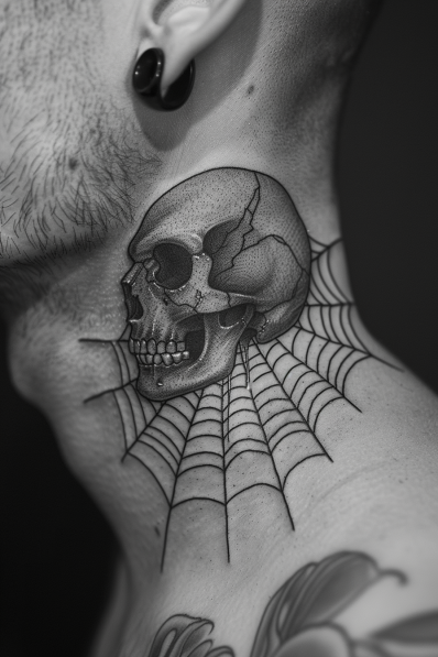 This tattoo features a skull with cracks running through it, perched on a detailed spider web that spreads across the neck. The shading on the skull creates a realistic, almost 3D effect, while the cracks add a raw and weathered look. The web underneath enhances the sense of entrapment or connection to something deeper, adding a darker, more ominous tone to the design. The fine linework of the web contrasts nicely with the heavier shading on the skull, making both elements stand out.