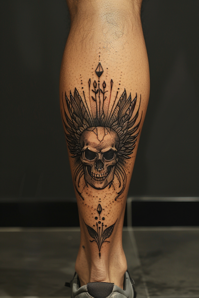 This tattoo features a skull with large, detailed wings that extend upward, symbolizing a mix of freedom and the inevitable passage of time. The wings are intricately shaded, giving them a sense of movement and life, while the skull remains stark and powerful at the center. Above the skull, geometric shapes and delicate floral designs add an interesting contrast, blending natural elements with abstract shapes. The entire piece is placed vertically, making it flow beautifully with the shape of the leg.