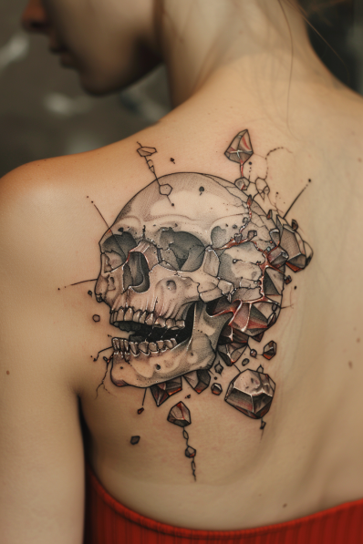 This tattoo features a skull being shattered, with fragments turning into crystalline shapes as they break away. The jagged, geometric crystals add a sense of chaos and beauty to the design, as the skull seems to dissolve into these sharp, multifaceted pieces. The contrast between the smooth shading on the skull and the intricate, angular shapes of the crystals gives the tattoo an edgy, almost surreal quality. The subtle hints of red in the crystals add an extra pop, making the entire piece feel alive and dynamic.