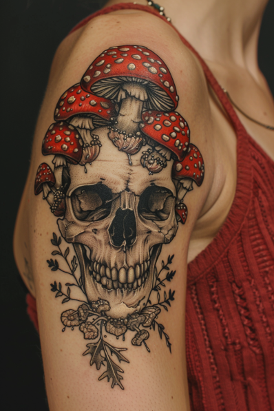 I really dig how this tattoo feels like something out of a dark fairytale. The mushrooms give it a whimsical, earthy vibe, while the skull adds that touch of mortality and mystery. It s a perfect representation of how life continues to grow, even after death nature always finds a way. Plus, the red of the mushrooms makes the whole design pop, giving it a surreal, almost fantasy-like quality. If you re into tattoos that combine nature with a dark twist, this one s got serious character!
